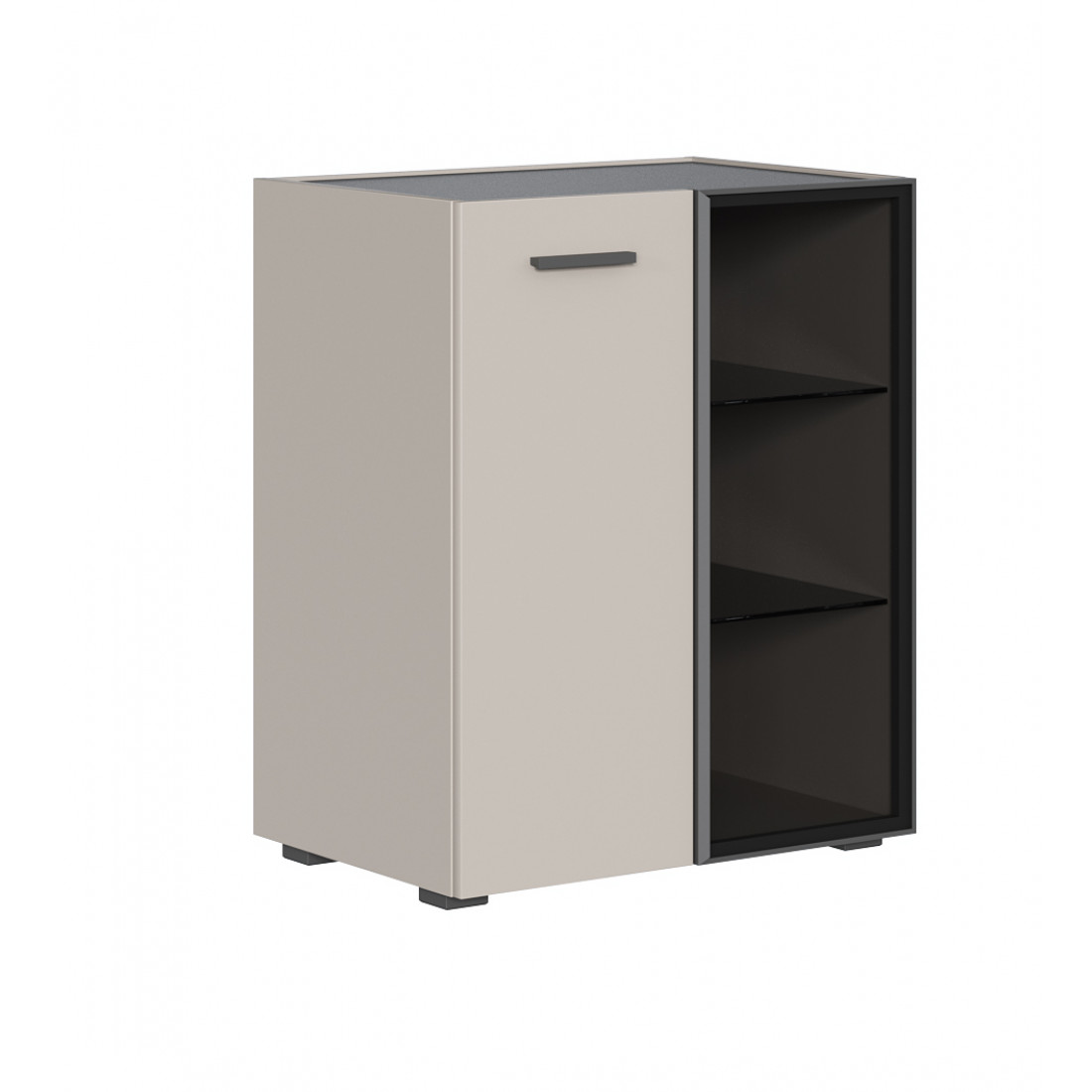 • Один фасад глухой из ЛДСП Кашемир серый, другой рамочный – профиль алюминиевый, стекло затемнённое;